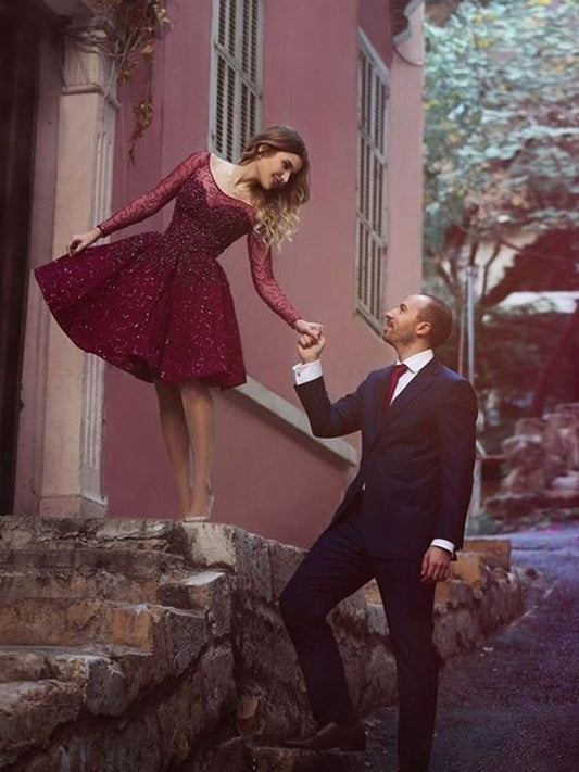 Vestidos cortos/mini de corte A/princesa, con mangas largas y encaje con cuentas