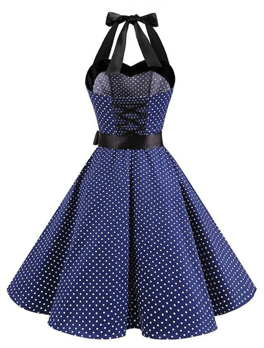 Vestido de cóctel retro vintage de lunares de los años 50, vestido vintage, vestido rockabilly, vestido halter acampanado, disfraz de Audrey Hepburn para mujer, vestido de fiesta de verano