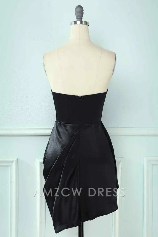Vestido corto de cuero plisado con escote en forma de corazón, elegante, negro, sin tirantes, para fiesta de bienvenida, Amzcw