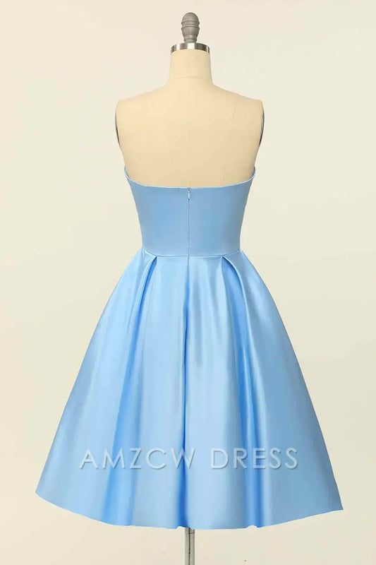 Amzcw Elegante Vestido Mini de Satén Azul con Corte A y Sin Tirantes para Fiesta de Bienvenida Vestidos Formales