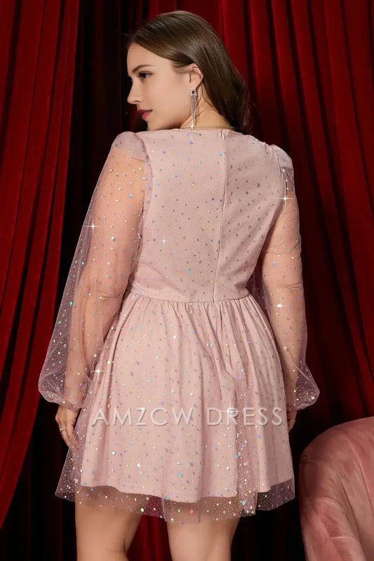 Amzcw Elegante vestido de fiesta rosa con escote en V profundo y mangas ilusión con cuentas, vestidos formales