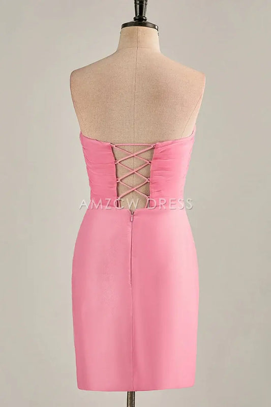 Amzcw Elegante vestido de fiesta de gasa rosa fuerte sin tirantes hasta la rodilla vestidos formales