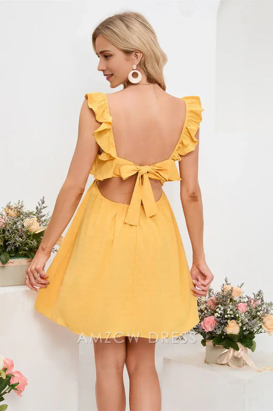 Vestido de fiesta Amzcw con mangas onduladas, cuello cuadrado y lazo, color amarillo, para uso formal