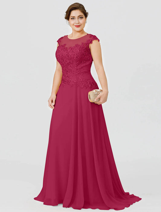 Vestido de madre de la novia de corte A, talla grande, elegante, escote ilusión, cola larga/corta, gasa, encaje con cuentas, manga corta, sin mangas, con lazo(s), pliegues