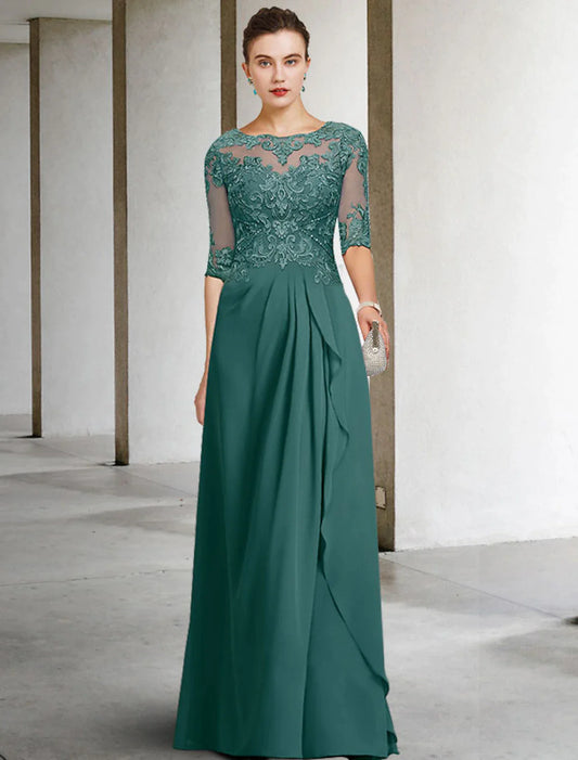 Vestido de madre de la novia de corte A, talla grande, elegante, cuello joya, largo hasta el suelo, gasa, encaje, media manga con pliegues y apliques de cuentas