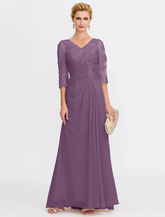 Vestido de madre de la novia de corte A, lujoso y elegante, con escote en V, largo hasta el suelo, encaje, tul, media manga y apliques plisados.