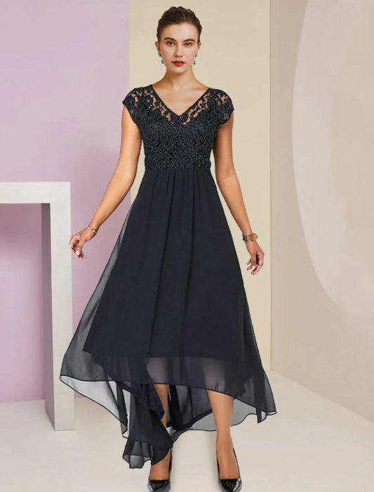 Vestido elegante de gasa con encaje, corte en A, para madre de la novia, talla grande, escote en V alto y bajo, largo hasta la rodilla, manga corta con pliegues y apliques
