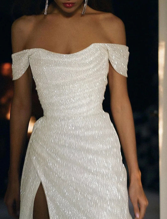 Vestidos de noche de sirena, vestido de novia brillante para recepción, vestido de fiesta, cola larga/corta, manga corta, hombros descubiertos, lentejuelas con abertura