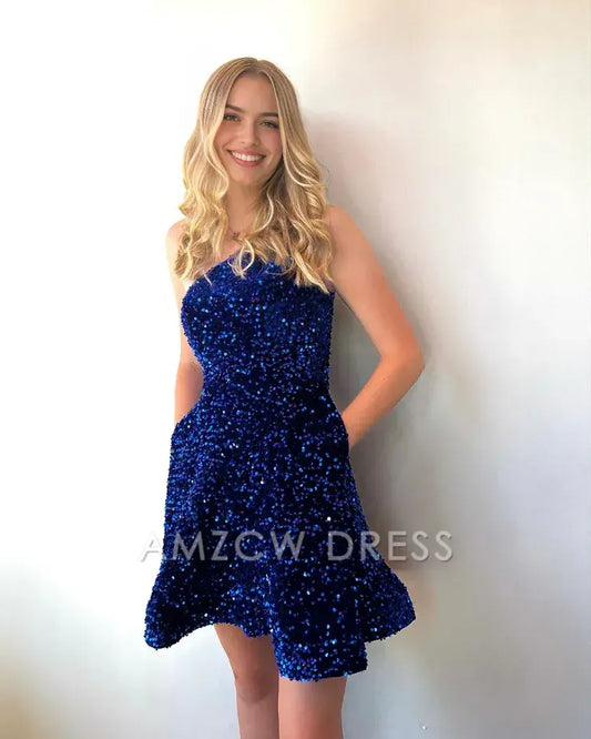 Vestidos de fiesta cortos Amzcw con lentejuelas azules, escote en V y tirantes finos, vestidos formales