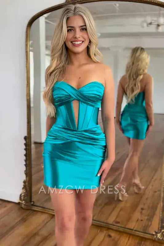 Vestidos de fiesta cortos Amzcw en azul pavo real sin tirantes, ajustados, con abertura en la cerradura, vestidos formales