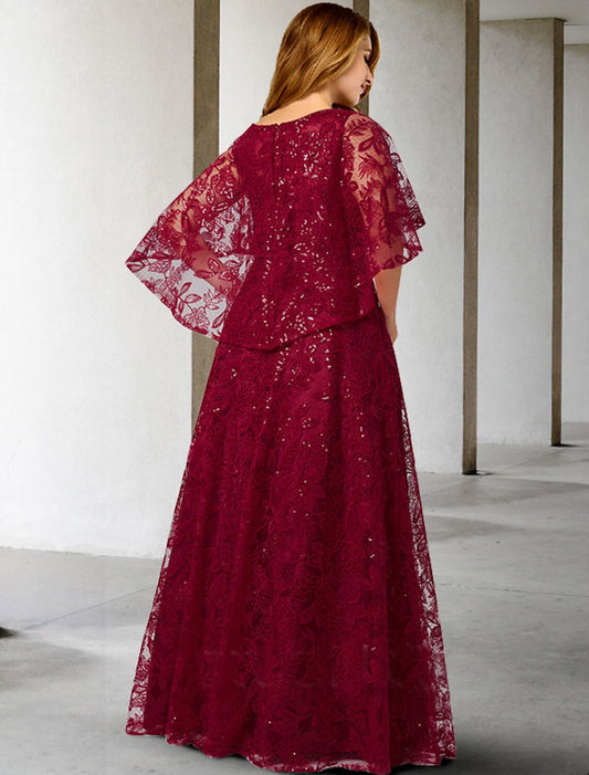Vestido de madre de la novia de corte A, talla grande, elegante, cuello joya, largo hasta el suelo, encaje, media manga, sin mangas, con apliques de lentejuelas