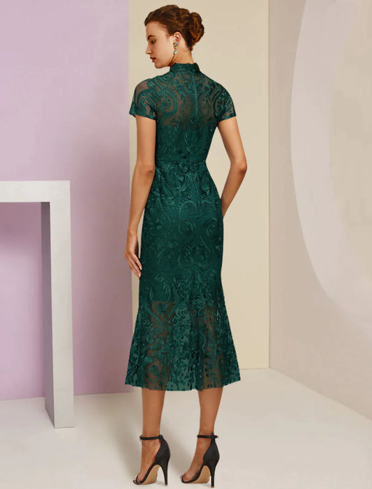 Vestido de Madre de la Novia con Corte Vaina/Columna para Invitadas de Boda Elegante Cuello Alto Largo hasta la Rodilla Encaje Manga Corta con Apliques