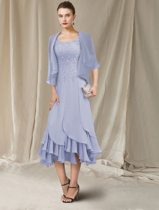 Vestido de dos piezas para madre de la novia, estilo tubo/columna, elegante, escote redondo, largo hasta la rodilla, de gasa, con encaje, mangas 3/4 y lazo(s).