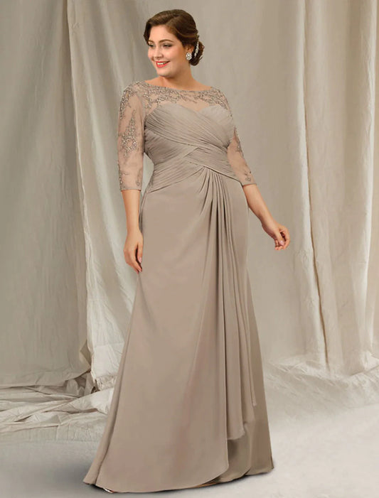 Vestido de madre de la novia de corte A, talla grande, elegante, cuello joya, largo hasta el suelo, de gasa, encaje, manga 3/4 con apliques fruncidos