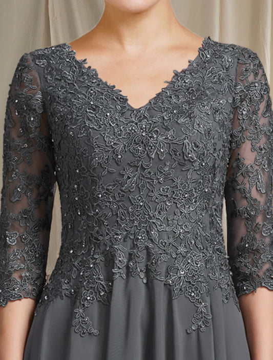 Vestido de madre de la novia de corte A, talla grande, elegante, escote en V, largo hasta la rodilla, de gasa, encaje, manga 3/4 con pliegues y apliques de cuentas.
