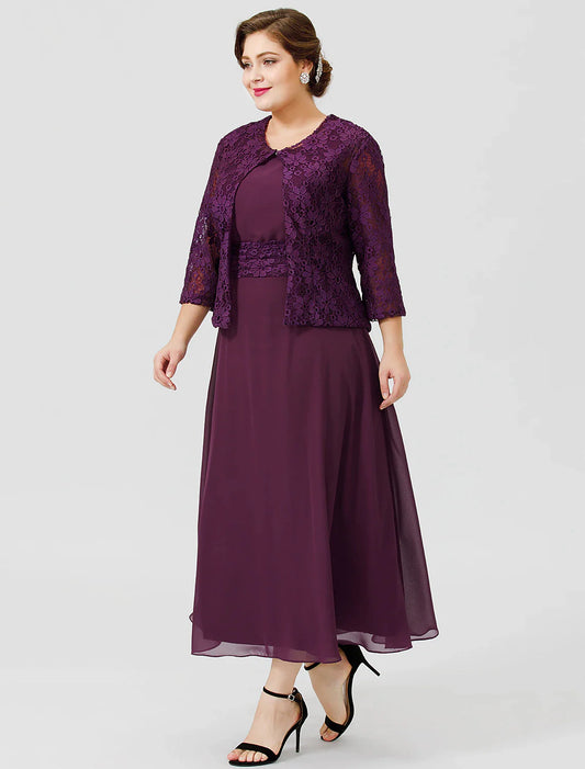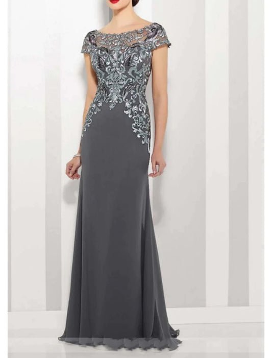 Vestido elegante de gasa con cuello joya, corte A, para madre de la novia, largo hasta el suelo, manga corta con encaje y apliques de encaje.