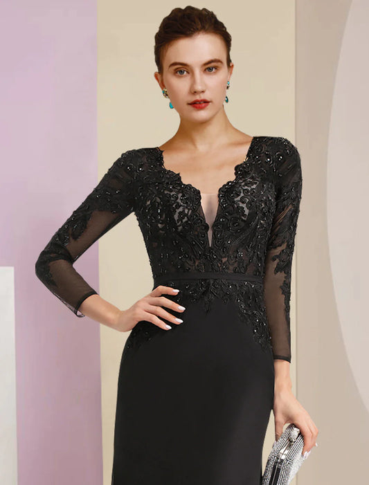 Vestido de madre de la novia elegante con escote en V, largo hasta el suelo, de gasa, media manga con cuentas y drapeado lateral.