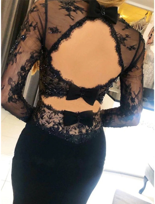 Vestidos de fiesta de sirena/trompeta con espalda abierta, vestido formal de corte en cola, manga larga, sin tirantes, tejido elástico, espalda descubierta con apliques de cuentas