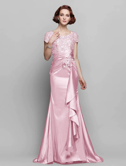 Vestido de sirena/trompeta para madre de la novia, transparente, escote redondo, cola larga/cepillo, tafetán con cuentas, encaje, manga corta con flores