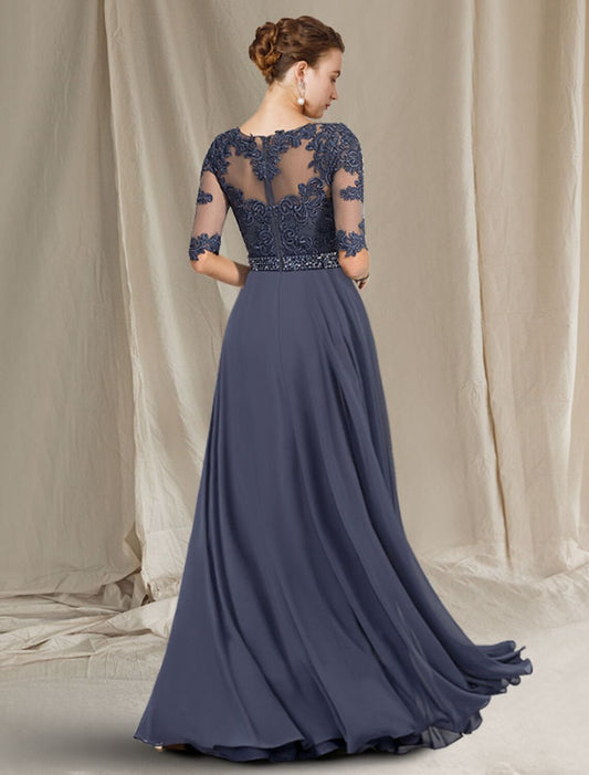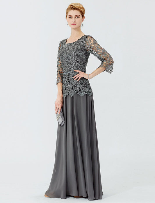 Vestido de baile Línea A Vestido de madre de la novia Formal Clásico y atemporal Elegante y lujoso Elegante Escote redondo Largo hasta el suelo Gasa Con cordón Encaje Manga 3/4 con fajas / cintas Abalorios