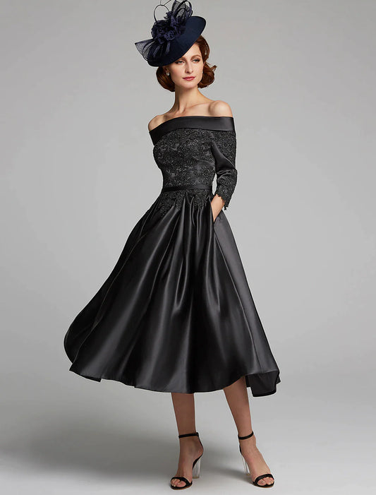 Vestido de madre de la novia de corte A, talla grande, sexy, con hombros descubiertos, largo hasta la rodilla, encaje de satén, manga 3/4 con faja/cinta de encaje