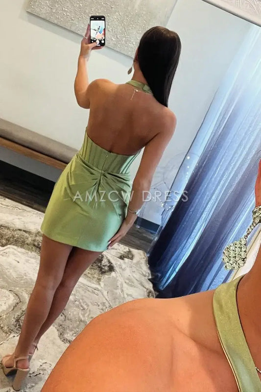 Vestidos de fiesta cortos de satén verde salvia con cuello halter y escote en V de Amzcw