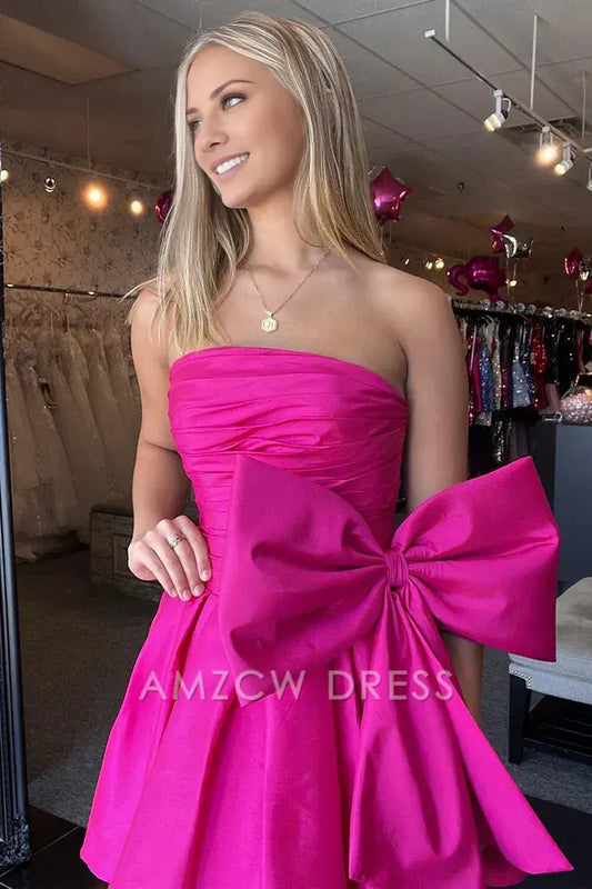 Vestidos de fiesta cortos de satén rosa intenso sin tirantes, corte A, con lazo, de Amzcw