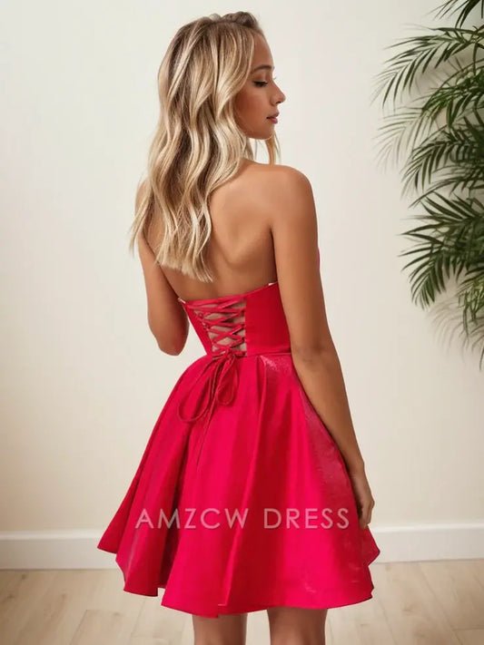 Vestidos de fiesta cortos de satén brillantes con escote en forma de corazón, bonitos y elegantes de Amzcw.