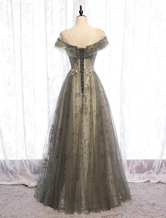 Vestido de fiesta de corte A, floral, para invitada de boda, largo hasta el suelo, sin mangas, hombros descubiertos, con encaje sobre tul y apliques bordados.