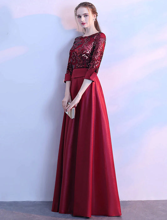 Vestido de noche formal elegante de fiesta brillante de corte A con cuello joya, mangas 3/4, largo hasta el suelo, satén con lentejuelas