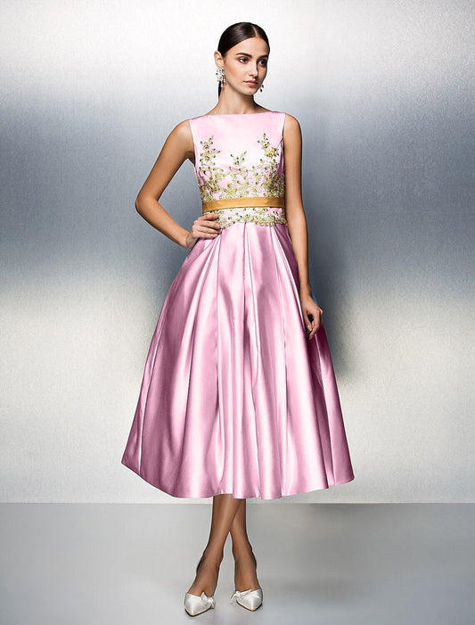 Vestido de fiesta de corte A para invitada de boda, largo hasta la rodilla, sin mangas, cuello joya, satén, espalda en V con pliegues y apliques