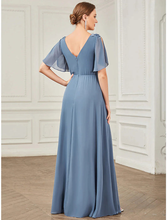 Vestido de fiesta de corte A, para invitada de boda, largo hasta el suelo, manga corta, cuello en V, de gasa con apliques fruncidos