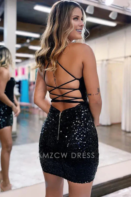Vestidos de fiesta cortos con lentejuelas negras y tirantes ajustados de Amzcw