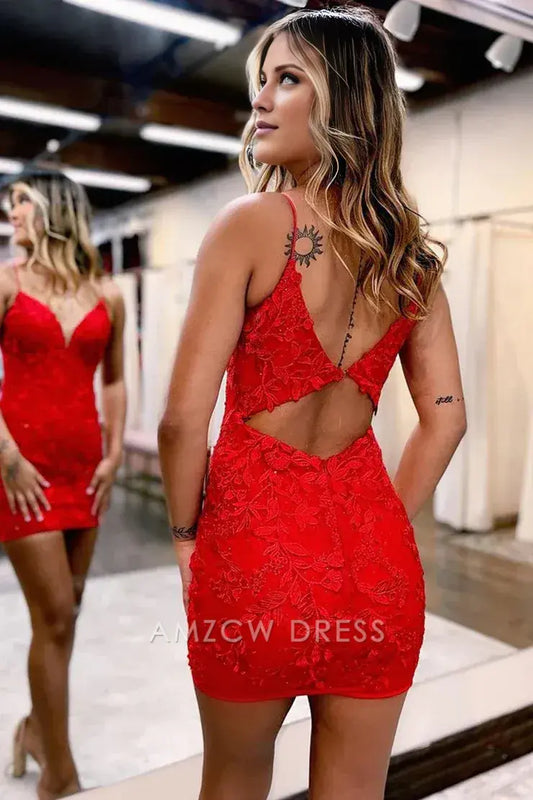 Vestidos de fiesta cortos de encaje rojo con escote en V y cuentas de Amzcw