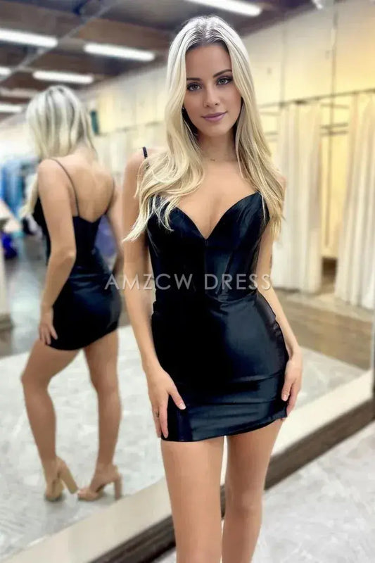 Vestidos de fiesta cortos de satén con escote en V, ajustados y sencillos de Amzcw