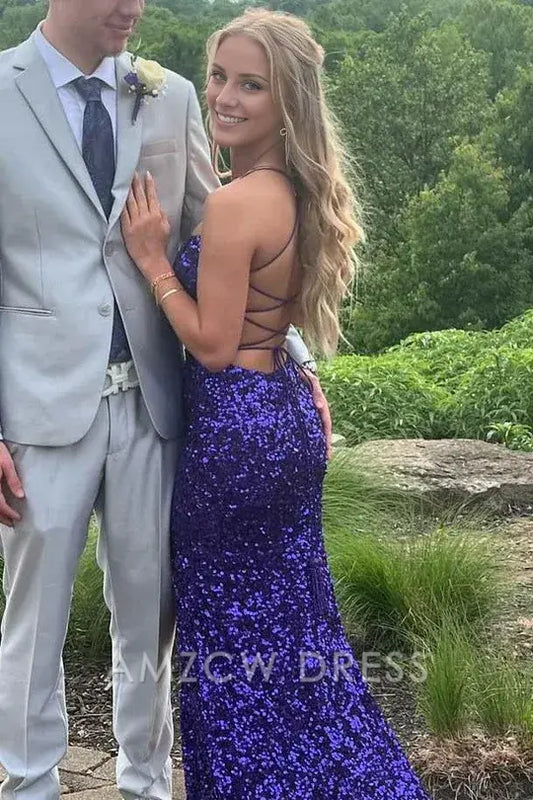 Vestido de fiesta largo estilo sirena con tirantes finos y lentejuelas clásico de Amzcw