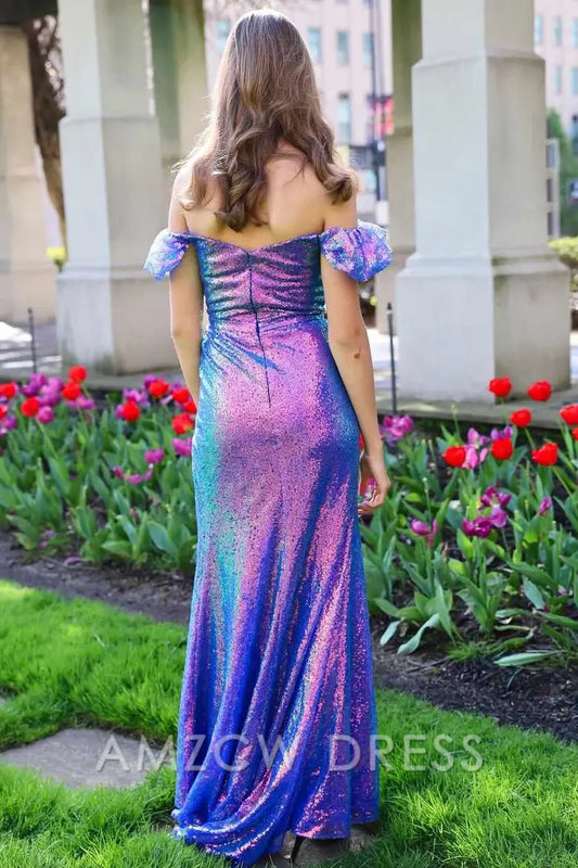 Vestido de fiesta largo estilo sirena con pliegues, lentejuelas y hombros descubiertos, brillante, de Amzcw