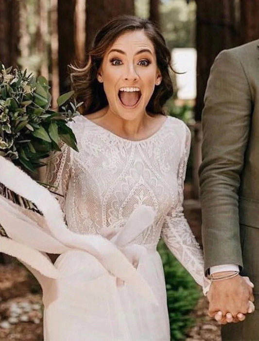 Vestidos de novia bohemios con espalda descubierta, corte A, escote redondo, manga larga, cola larga, encaje, pliegues y apliques para verano y otoño.