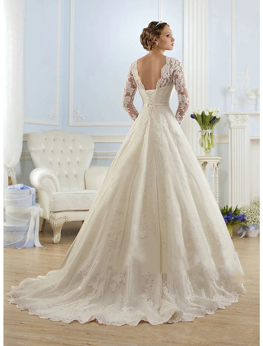 Vestidos de novia formales de otoño para compromiso, vestido de baile, cuello ilusión, manga larga, cola de corte, vestidos de novia de encaje con apliques