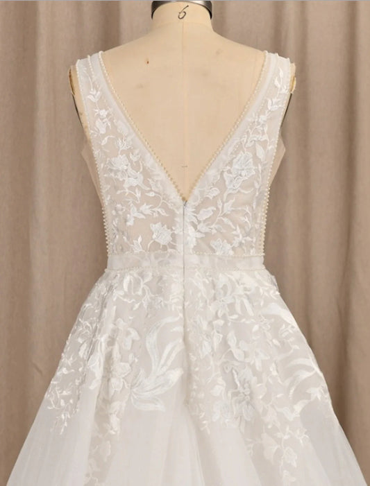 Vestidos de novia de playa, corte A, escote en V, sin mangas, cola larga, encaje, con apliques