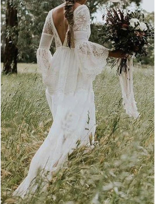Vestidos de novia bohemios de playa, corte A, escote en V, manga larga, hasta el suelo, de encaje