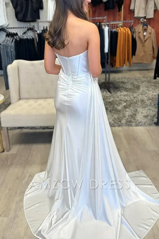 Vestido largo de fiesta formal con cola y plisado de satén blanco sin tirantes de Amzcw