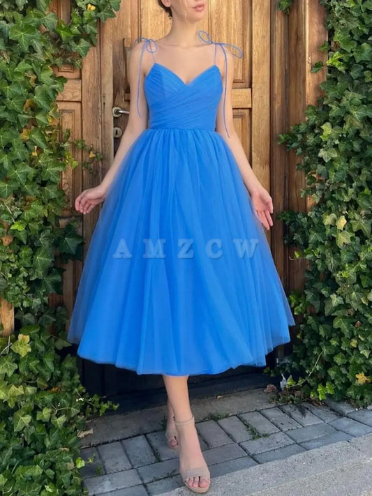 Vestido de fiesta corto de tul con escote en V azul de Amzcw, vestido de fiesta azul para regreso a casa, vestido de fiesta en tienda.