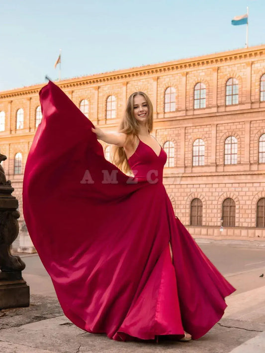 Amzcw Vestido de fiesta largo de satén rojo oscuro con escote en V sencillo, vestido de dama de honor de satén rojo, tiendas de vestidos de fiesta