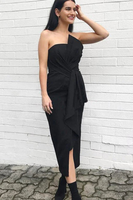 Vestidos de dama de honor con corte tubo/columna, apliques de encaje, hombros descubiertos, sin mangas, largo hasta la rodilla