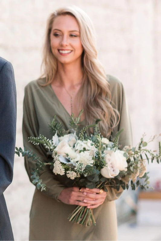Vestido de dama de honor de satén con escote en V, manga larga y corte en A, cruzado y cintura atada