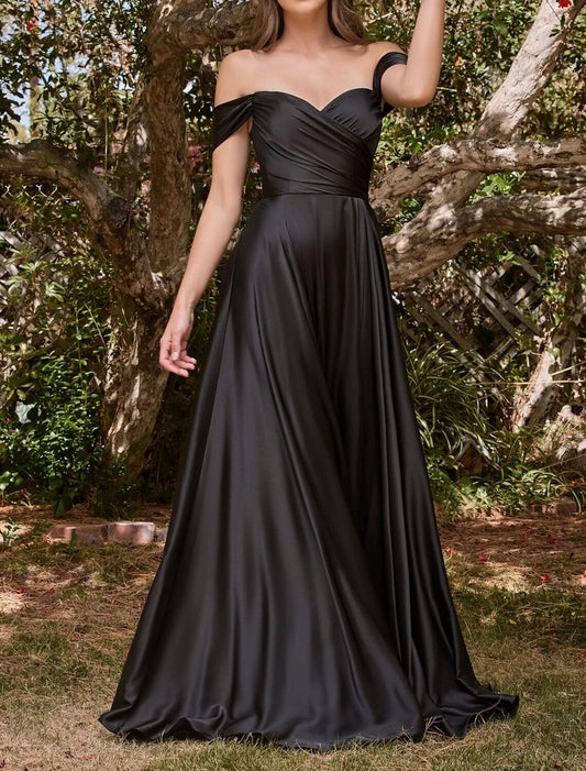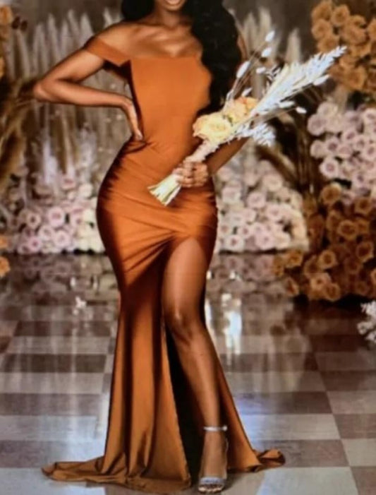 Vestido de dama de honor estilo sirena/trompeta, hombros descubiertos, manga corta, sexy, cola larga/cepillo, charmeuse, abertura frontal, color liso