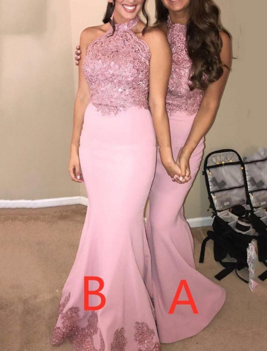 Vestido de dama de honor estilo sirena/trompeta, sin mangas, con cuello halter, hermosa espalda descubierta/cola de cepillo, encaje/gasa elástica con pliegues/color sólido