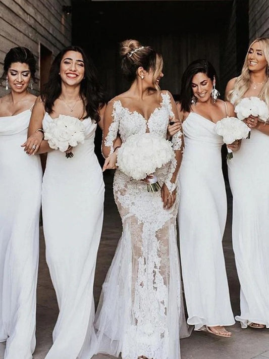 Vestidos de dama de honor de corte tubo/columna de gasa fruncida con tirantes finos sin mangas y largo hasta el suelo