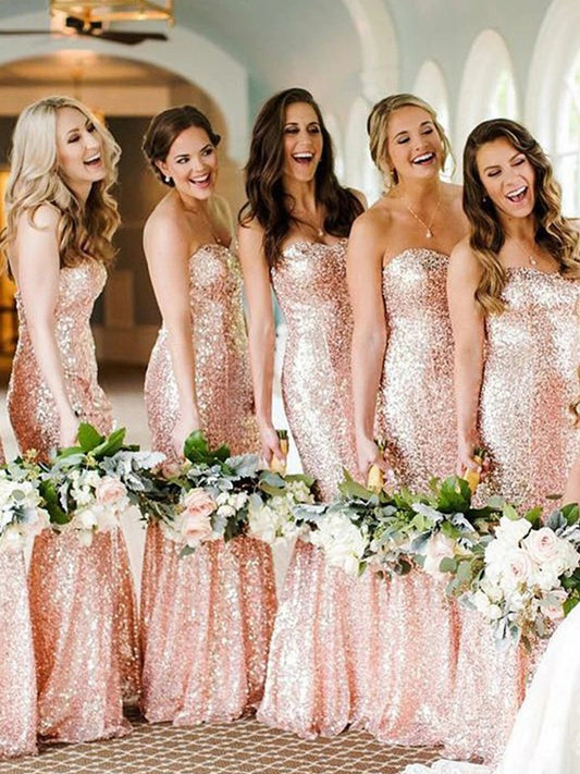 Vestidos de dama de honor con escote corazón, sin mangas, con lentejuelas y cola larga